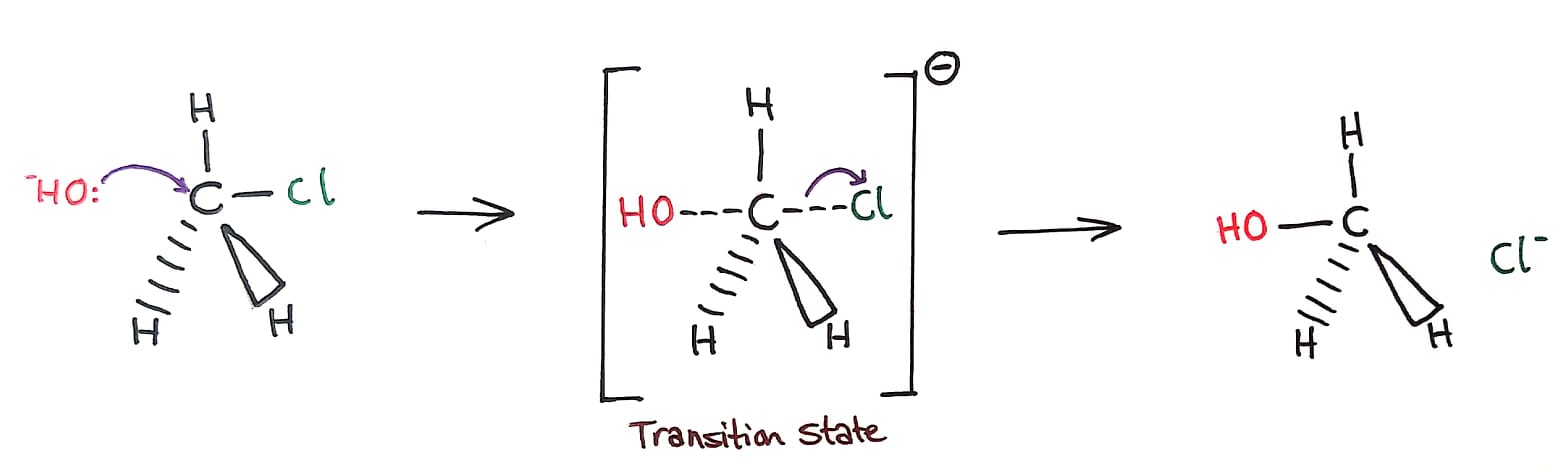 In SN2 reactions, the nucleophile forms a ‘5th bond’ with the central carbon to form an unstable transition state. The C-Halogen bond then breaks and the new product is formed.